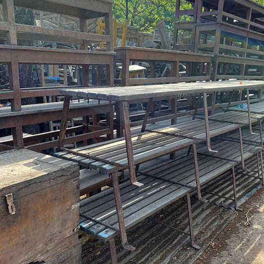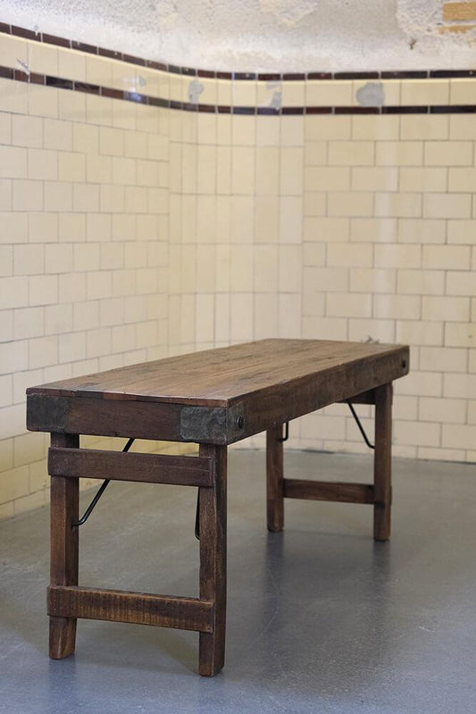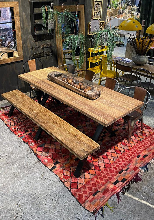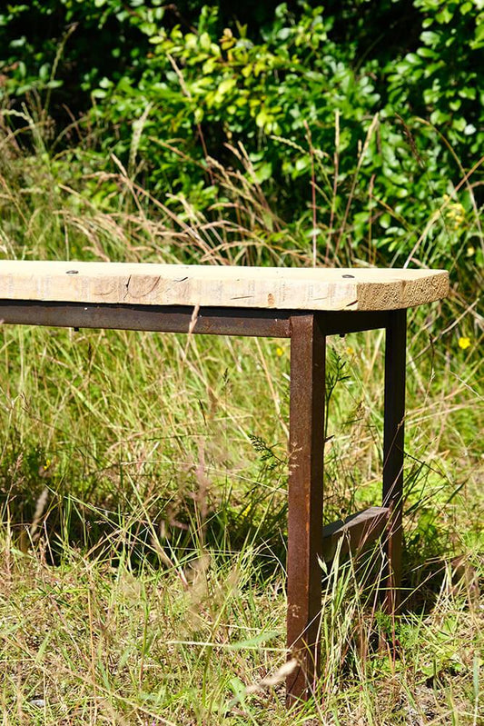 Lang bænk i genanvendt træ med rå jernkanter.