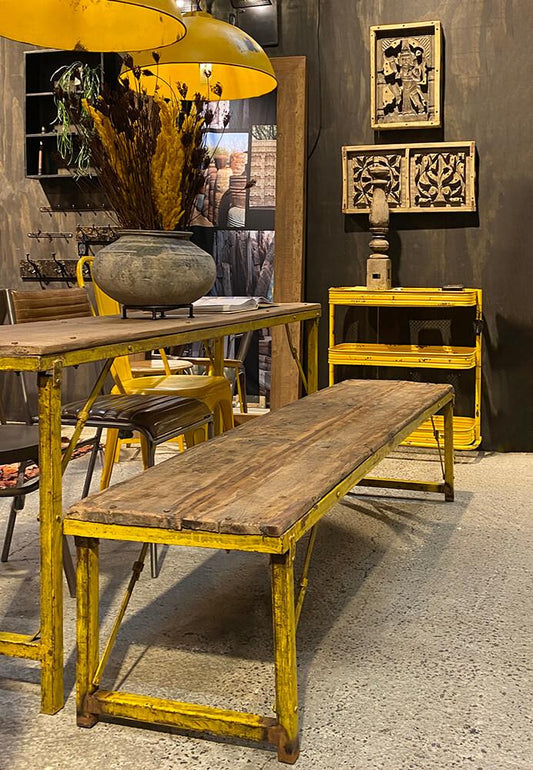 Bænk med gult jernstel - genbrugsmetal og genbrugstræ