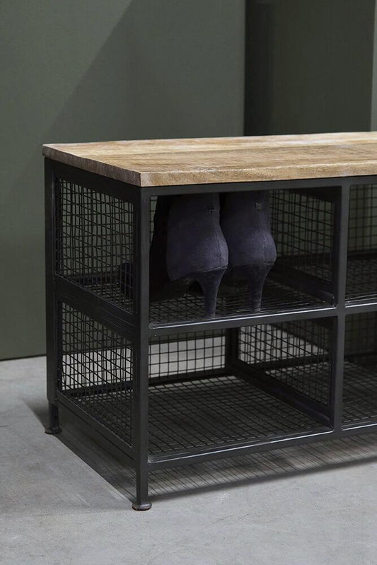 Bænk som skoreol - jern/træ.