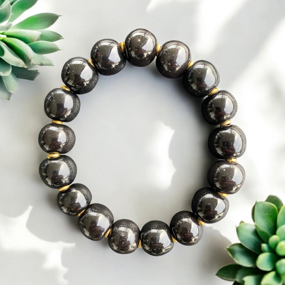 Enkelt og smukt elastik armbåndbånd med sorte keramikperler. Mål: Ca 19 cm.