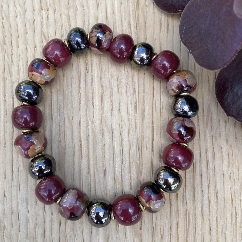 Perle armbånd i håndlavede keramik perler. Glaseret i en smuk bordeaux farvede glasur tilført klare gyldne nuancer. Længde ca 19 cm