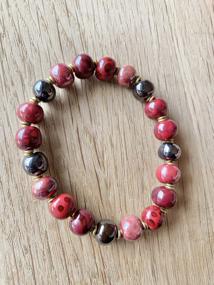 Armbånd med keramikperler, monteret på elastiktråd. Mål: ca 19 cm. Rødt med rødt