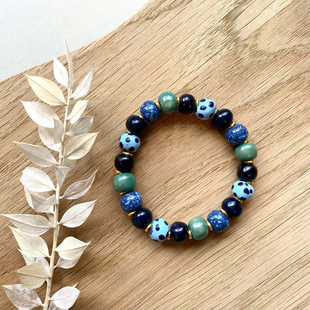 Armbånd med keramikperler, monteret på elastiktråd. Mål: ca 19 cm. Blå og grøn mix