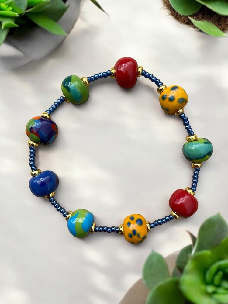 Armbånd med keramikperler, monteret på elastiktråd med glasperler. Ca 19 cm. Multifarvet
