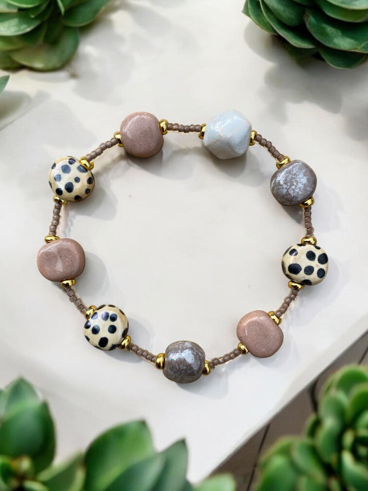 Armbånd med keramikperler, monteret på elastiktråd med glasperler. Mål: ca 19 cm. Nude farvet