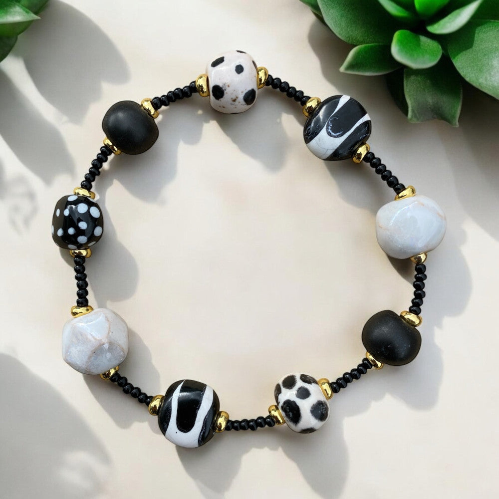 Armbånd med keramikperler, monteret på elastiktråd med glasperler. Ca 19 cm. sort/hvid
