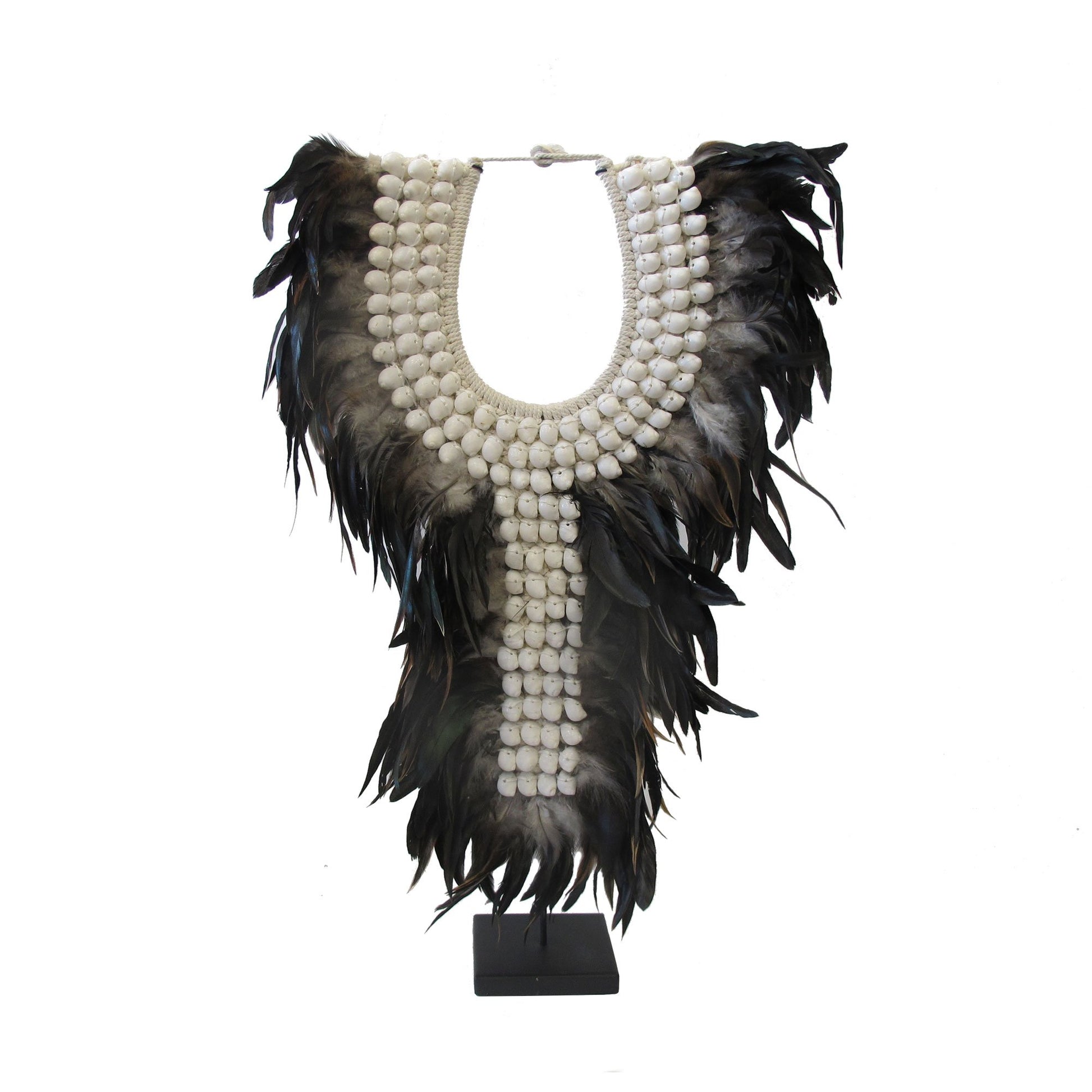 Stor flot halssmykke med fjer og konkylier monteret på stand.
