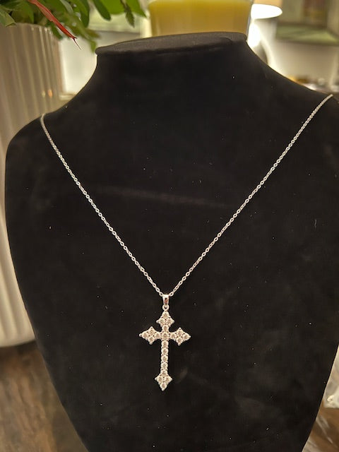Sølvkors belagt med platin og mange små labgrown moisanitter. Kæde medfølger 40 cm + 5 cm. Vægt uden kæde 4 gram.