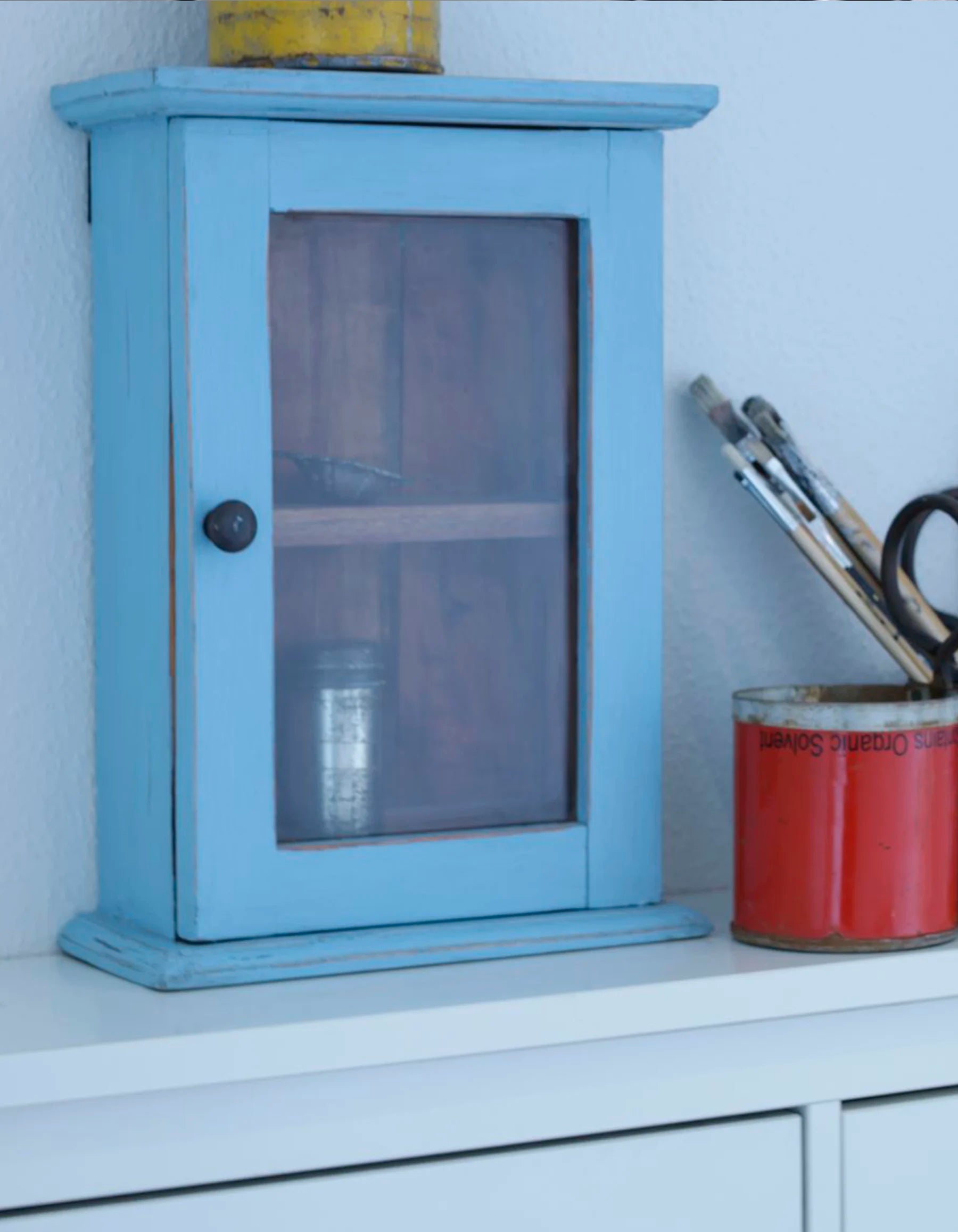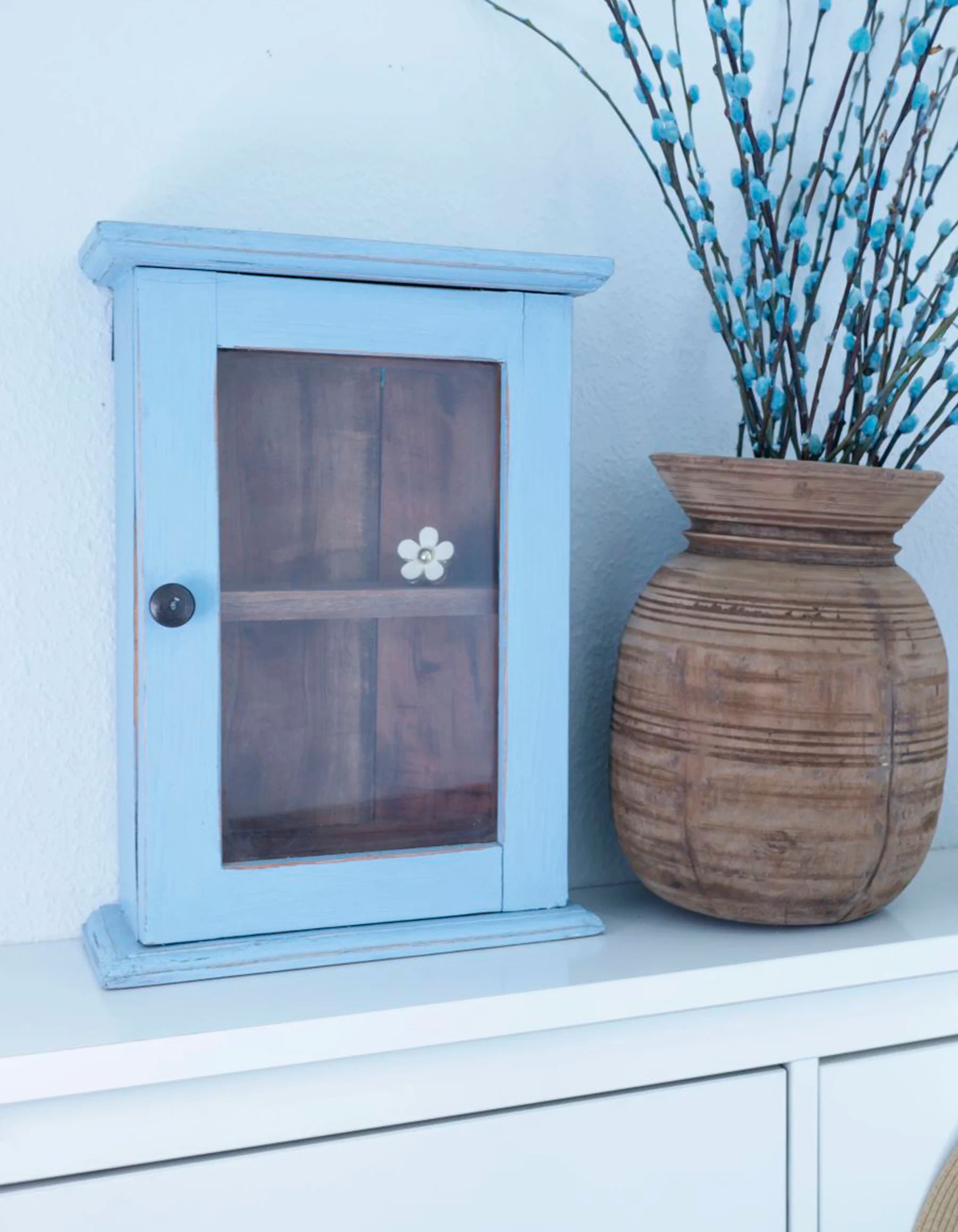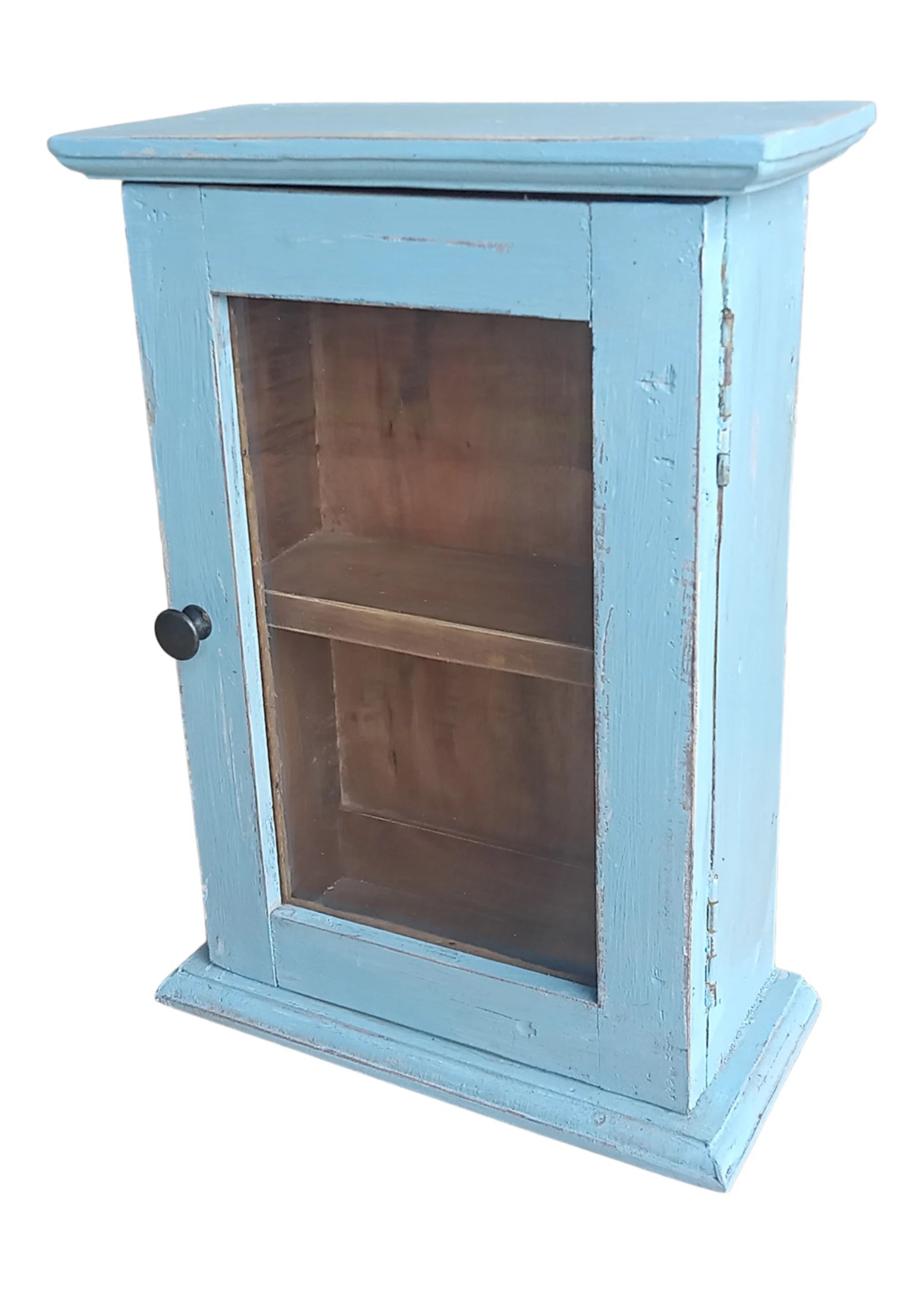 LILLE SMUKT VÆGSKAB, BLÅ MED GLASLÅGE.