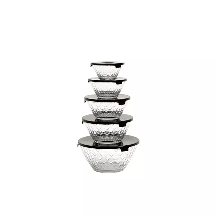 OPBEVARINGSSKÅLE I KLAR GLAS MED SORTE LÅG. SKÅLENE HAR ET FINT MØNSTER OG LÅGENE ER TÆTSIDDENDE. FINE OG DEKORATIVE TIL BRUGE I KØKKENET OG TIL SERVERING SÆTTET MED 5 FORSKELLIGE STØRRELSER.