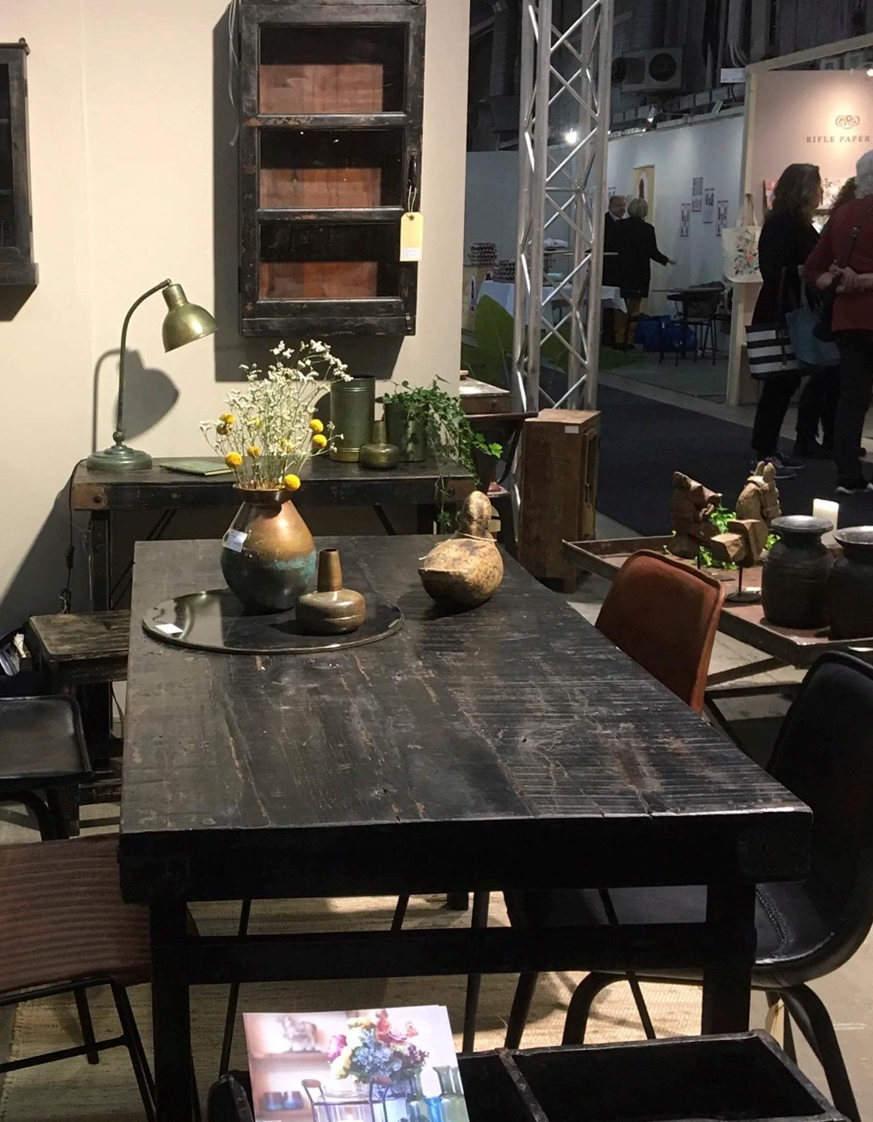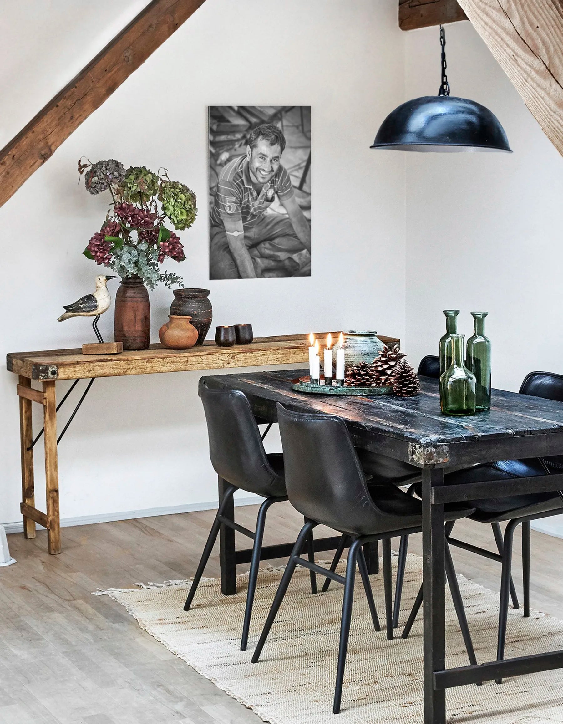 Brug bordet som spisebord eller skrivebord. Det vil tilføre rummet noget helt autentisk, uanset, hvordan du bruger det. Bordet kan klappes sammen. Vi har påført den flotte sorte finish på et originalt bord. Bemærk derfor, at bordpladerne kan være forskellige i udtrykket. Nogle har forskellige farvenuancer og andre har mindre reparationer eller brugsmærker. Fælles for dem er en helt unik og skøn patina.