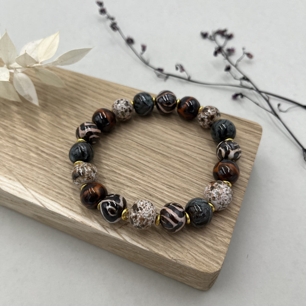 Armbånd med keramikperler, monteret på elastiktråd. Mål: ca 19 cm. Gyldne brune nuancer