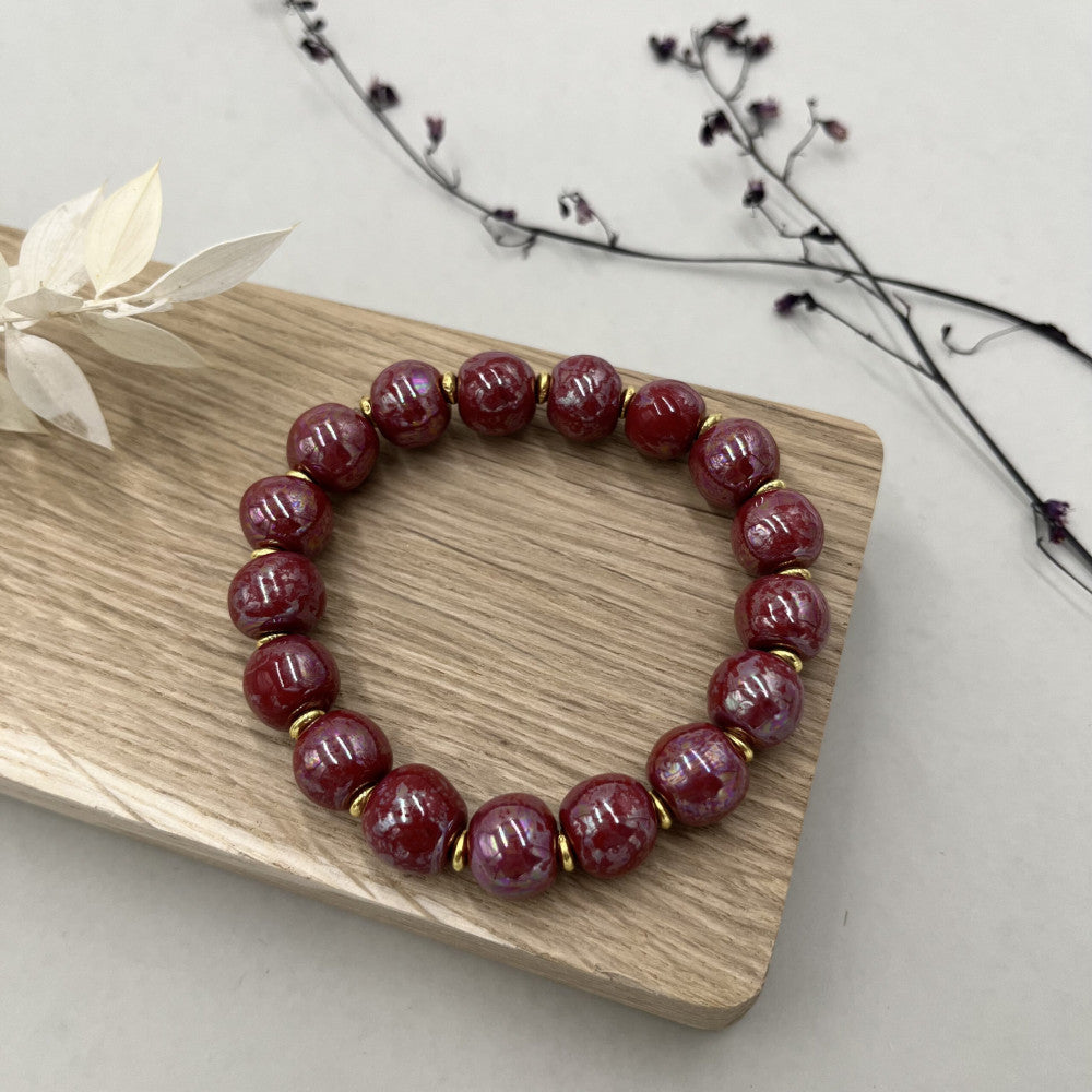 Armbånd med keramikperler, monteret på elastiktråd. Mål: ca 19 cm. Klar rød med perlemor
