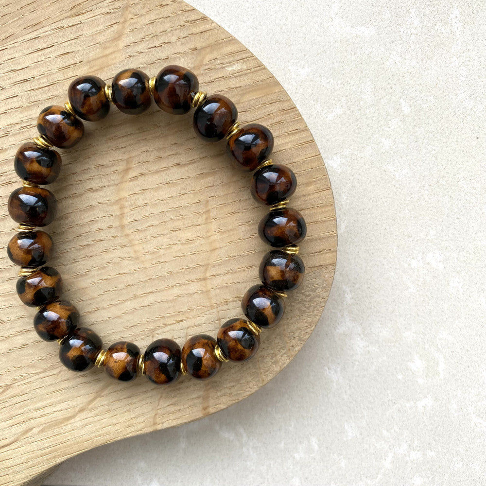 Armbånd med keramikperler, monteret på elastiktråd. Mål: ca 19 cm. Smuk og mørk gylden farve
