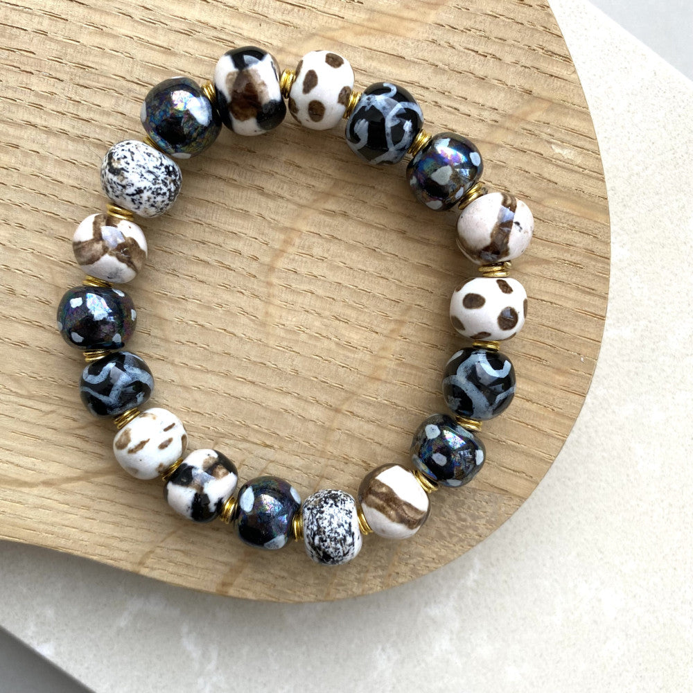 Armbånd med keramikperler, monteret på elastiktråd. Mål: ca 19 cm. Mix af sort,hvid og brune nuancer med perlemor