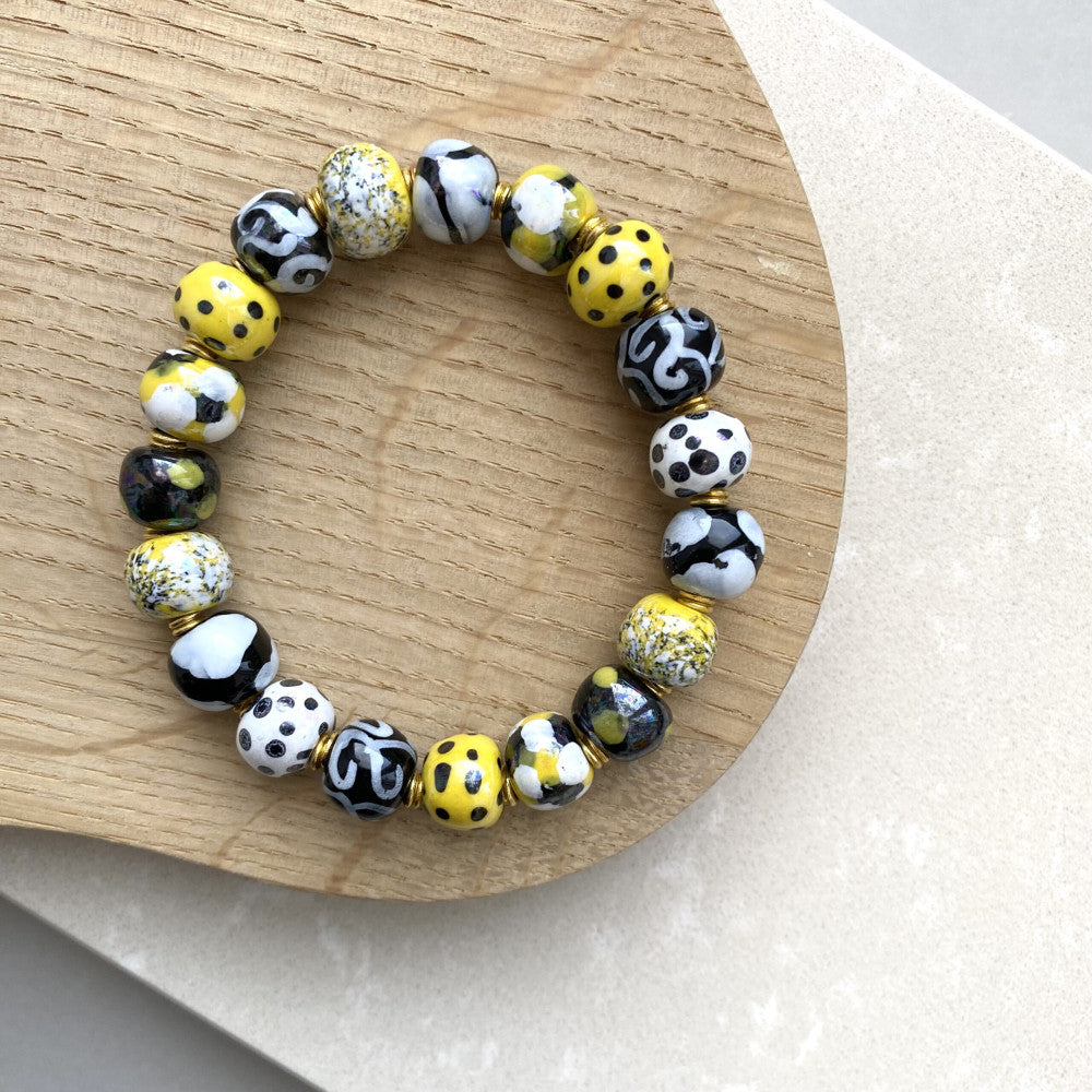 Armbånd med keramikperler, monteret på elastiktråd. Mål: ca 19 cm. Sort og gul farvemix med perlemor