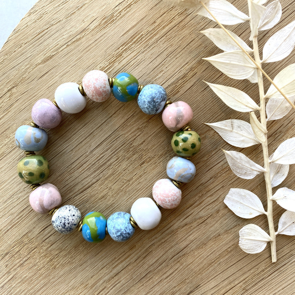 Armbånd med keramikperler, monteret på elastiktråd. Mål: ca 19 cm. Lækkert pastel farve mix