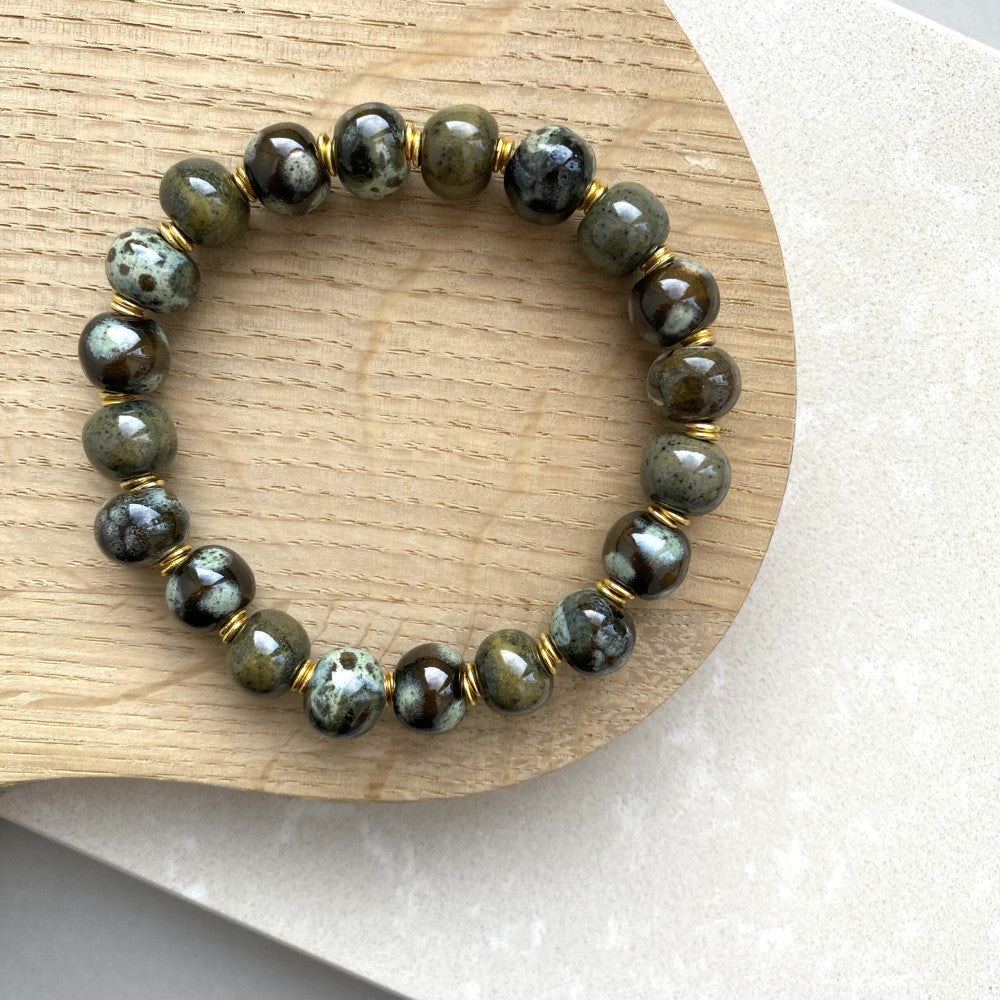 Armbånd med keramikperler, monteret på elastiktråd. Mål: ca 19 cm. Mørk grøn mix