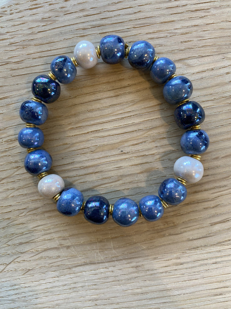 Armbånd med keramikperler, monteret på elastiktråd. Mål: ca 19 cm. Blå nuancer med perlemor
