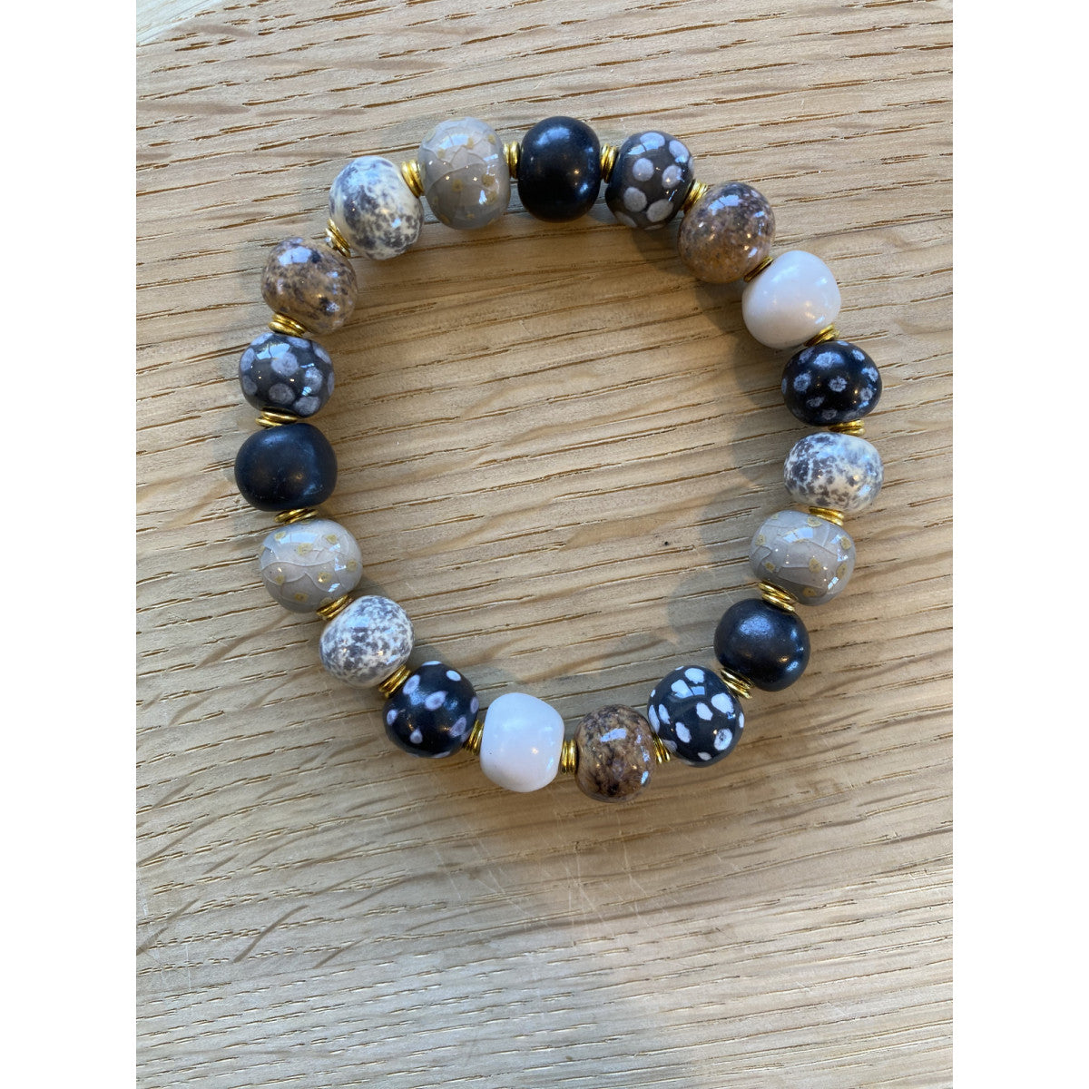 Smukt armbånd med matte keramikperler i jordfarver. Mål: ca. 19 cm