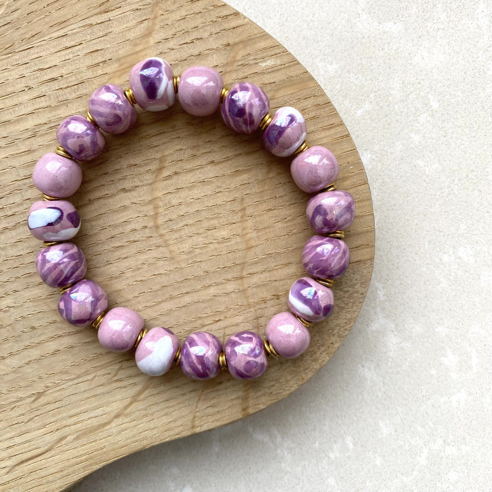 Armbånd med keramikperler, monteret på elastiktråd. Mål: ca 19 cm. Rosafarvet med perlemor