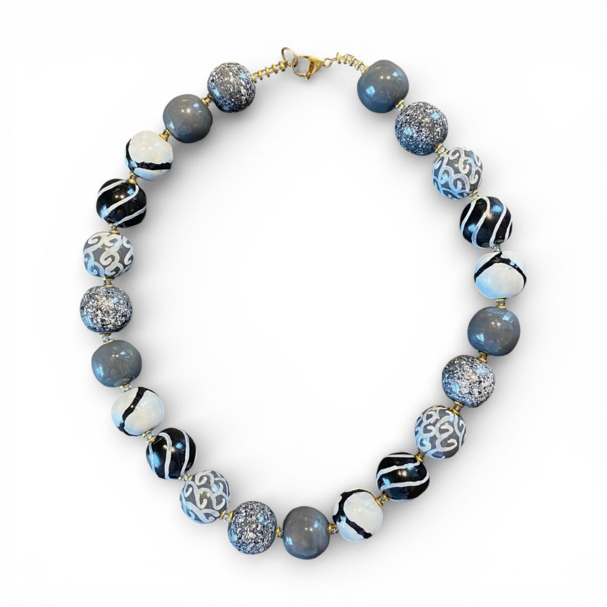 Perlekæde med håndlavede keramikperler. Glaseret med grå, sort og hvidt glasur i afstemte mønstre. Perle str: Ca 18 mm Længde: Ca 48 cm