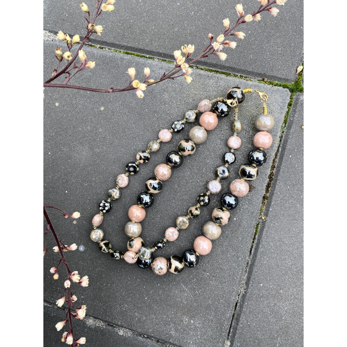 Keramik perlekæde med runde håndlavede perler. Gammelrosa farve med mørke klare perler. Tilsat perlemor. Mål: Ca 48 cm.