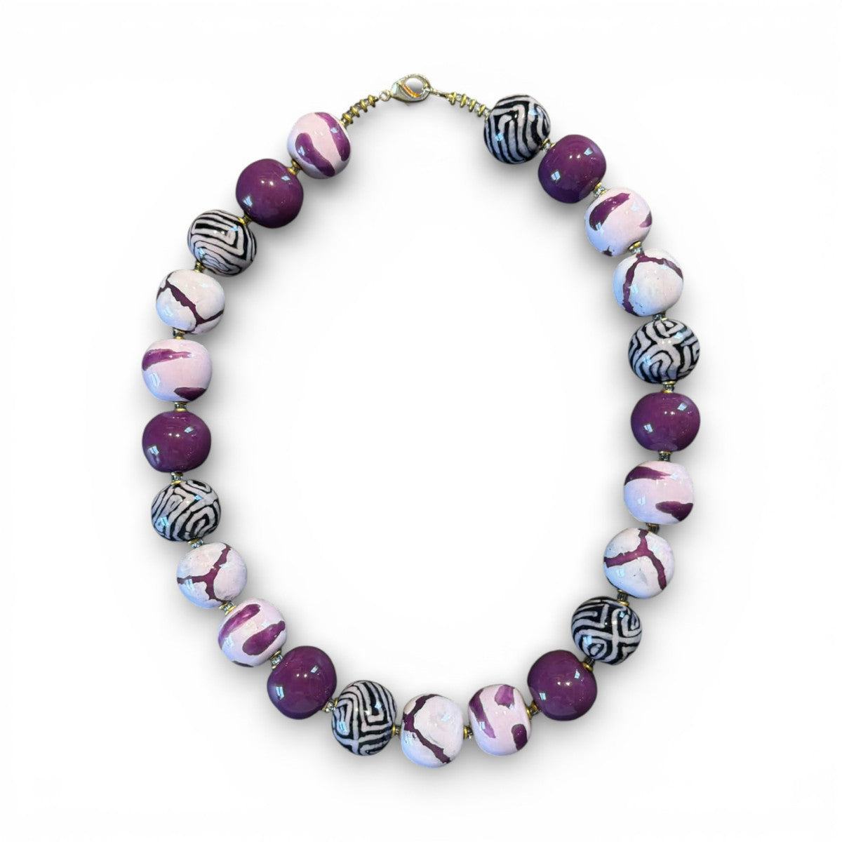 Keramik perlekæde med runde håndlavede perler. Lilla og hvide glasurer med sjove mønstre. Mål: Ca 48 cm.