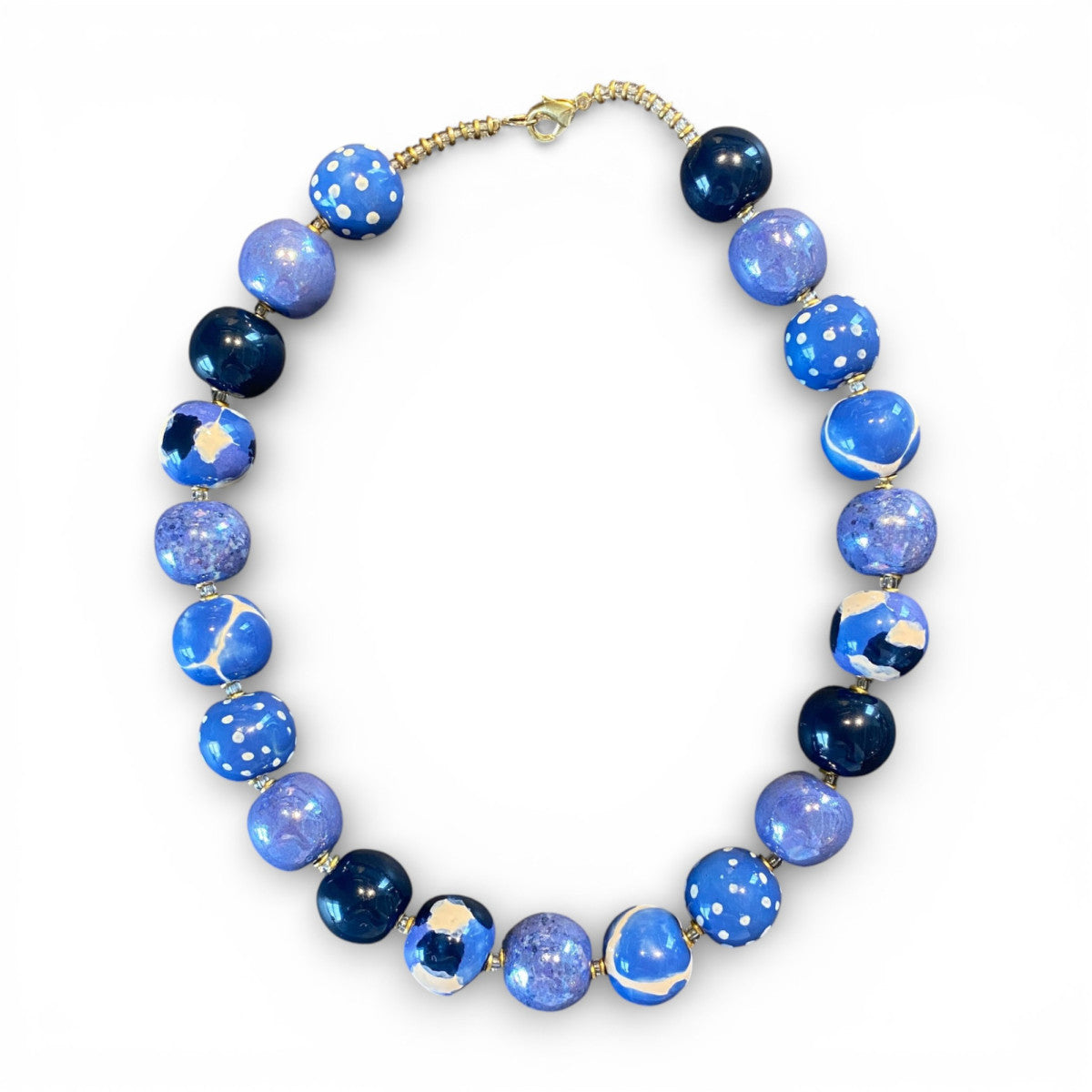 Keramik perlekæde med runde håndlavede perler. Blå nuancer tilført perlemor. Mål: Ca 48 cm