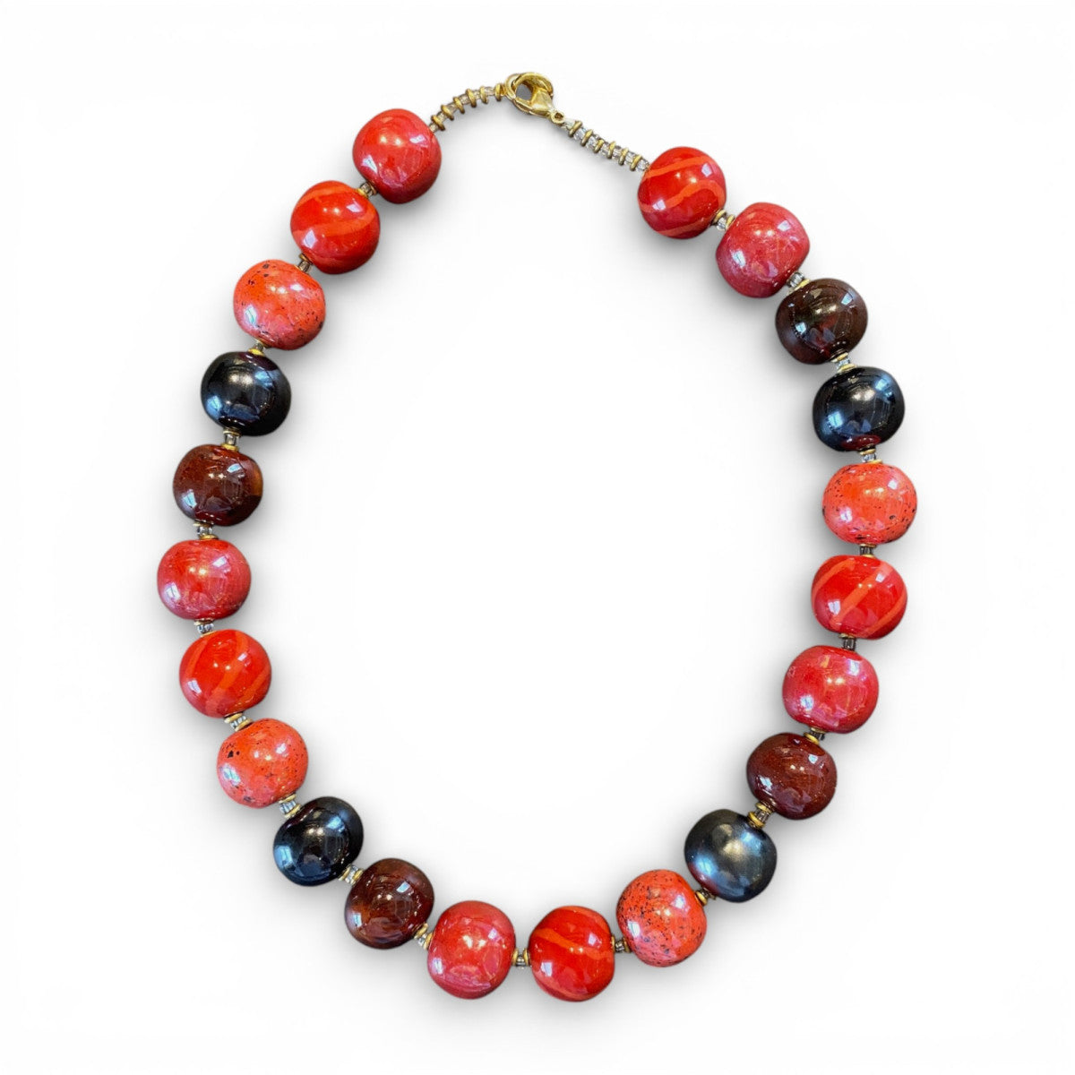 Keramik perlekæde med runde håndlavede perler. Flot mix med røde nuancer tilført et lille strejf af koral. Mål: Ca 48 cm.