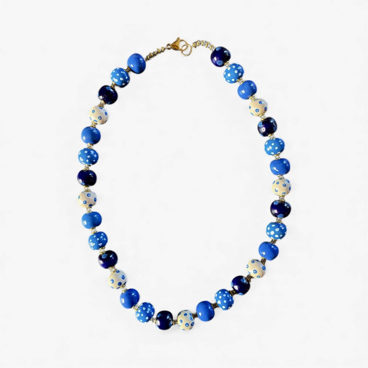 Halskæde i blå og hvide farver. Længde ca 48 cm. Perle str ca 12 mm
