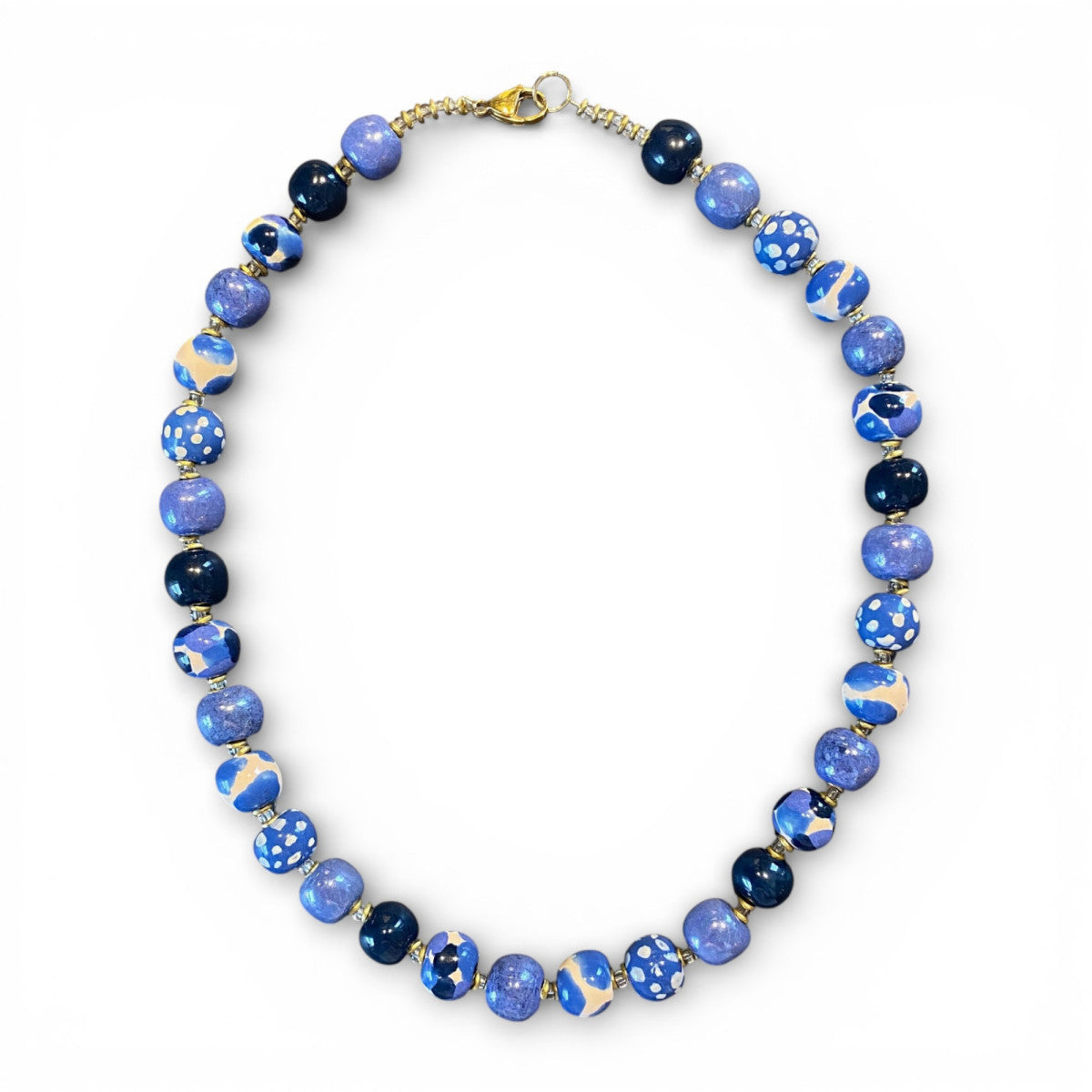 Perlehalskæde lavet af keramik. Skønne blå nuancer i et perfekt match af mønstre. Mål: Ca 48 cm.