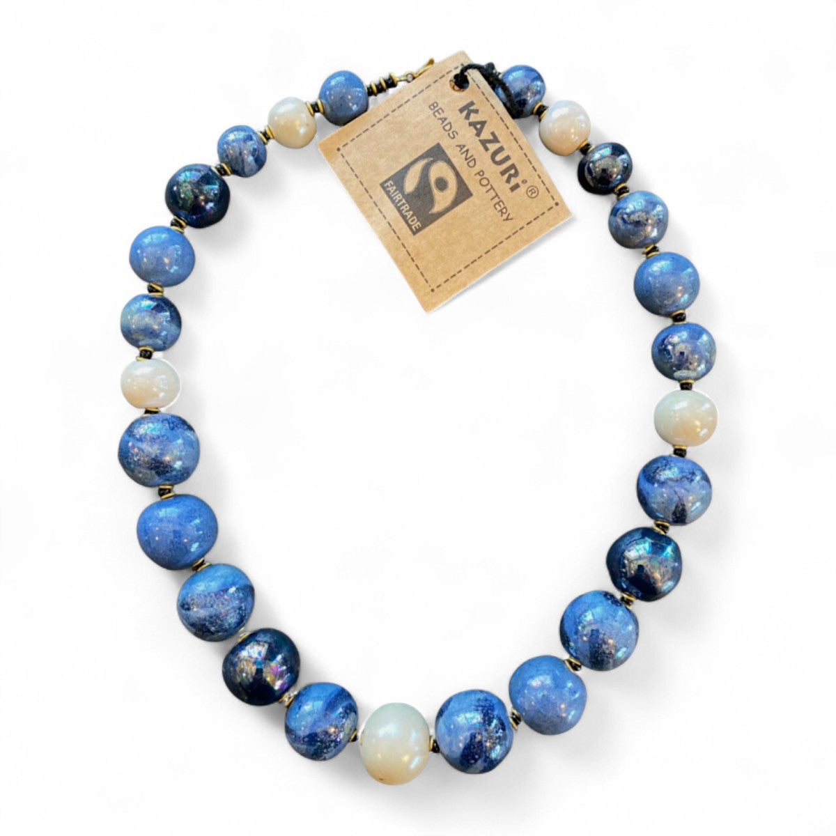 Keramik perlekæde i forløb. Blå og lyse toner med perlemor. Mål: Ca 48 cm.