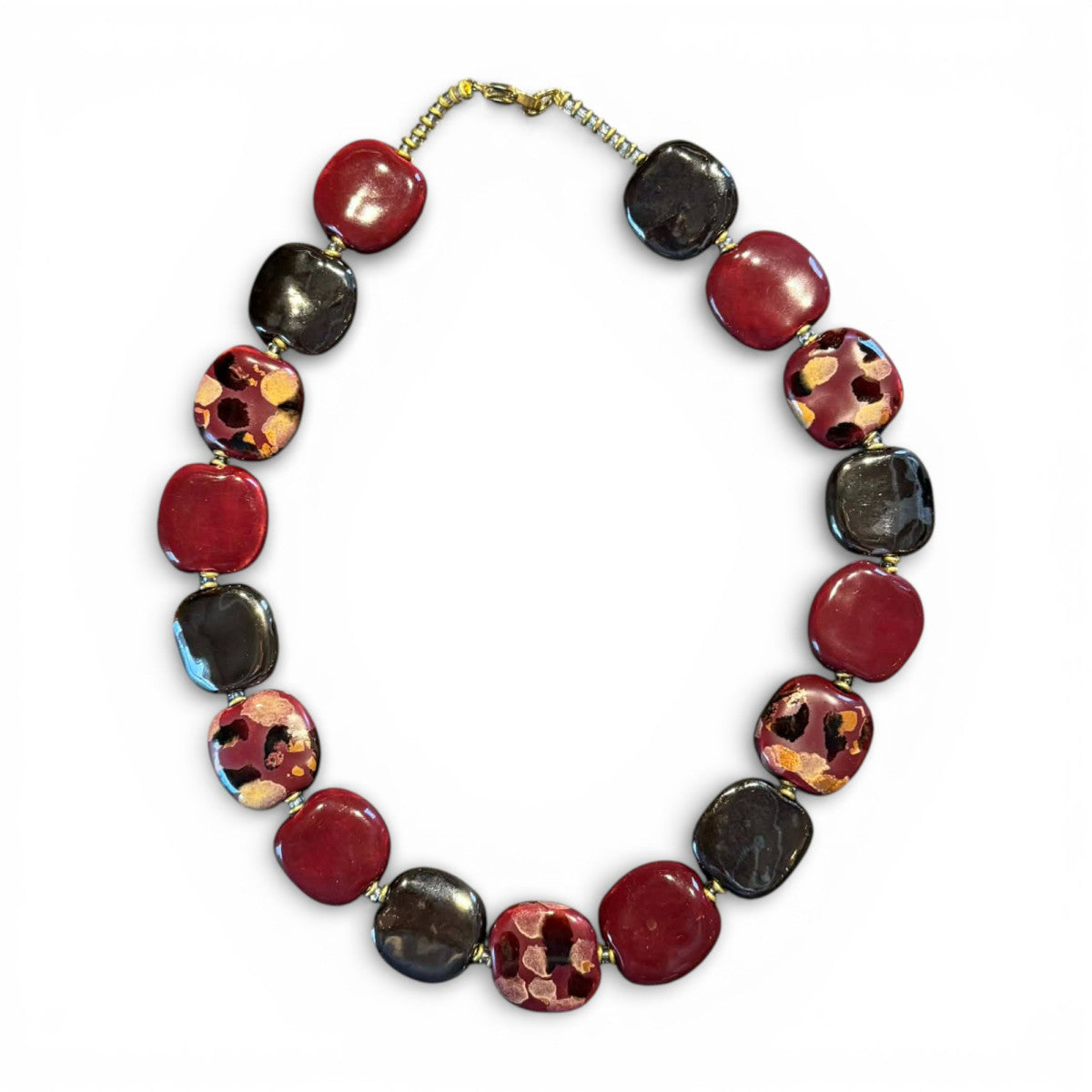 Perlekæde. med håndlavede flade keramiske perler. Glaseret i bordeaux og antique gold. Længde ca 48 cm .