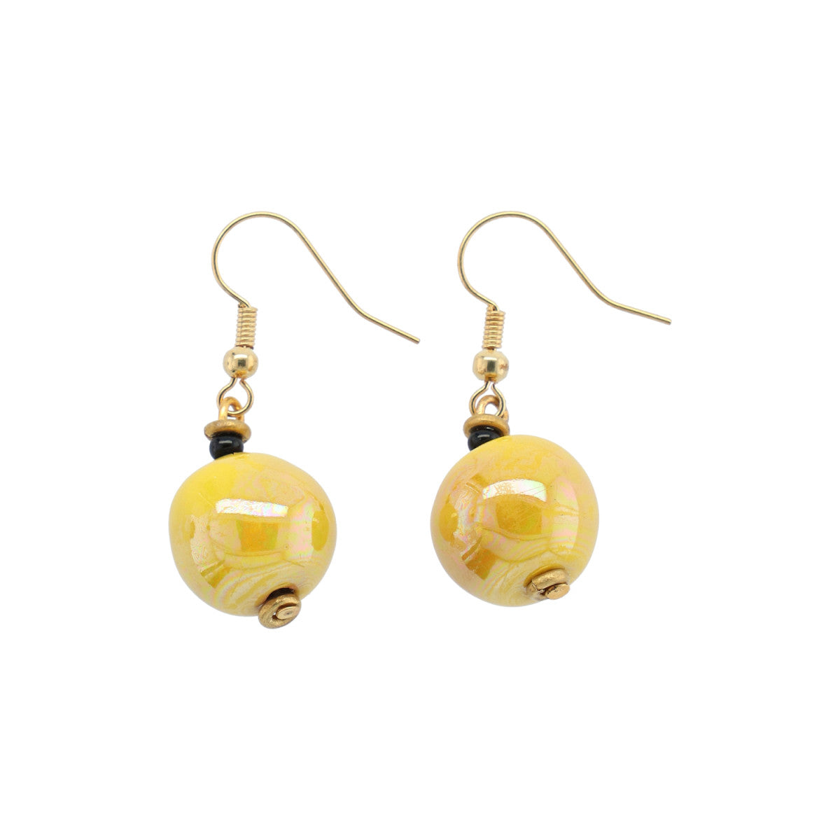 Smukke keramik øreringe i gul med perlemor som matcher ethvert outfit. ( sæt a´ 2 stk ) Perle str: Ca 10 mm.