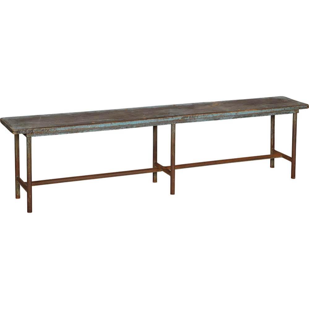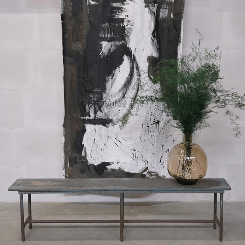 Denne lange, rustikke bænk har en fantastisk rå charme med sin kombination af jern og træ. Den solide træsædeplade hviler på en ramme af patineret jern, hvilket giver bænken et maskulint udtryk, der vil passe perfekt i en industriel eller vintage-inspireret indretning. Den rustikke overflade og det enkle design gør bænken til et ideelt valg i et hjem, en butik eller en café, hvor den kan tilføje både kant og karakter.