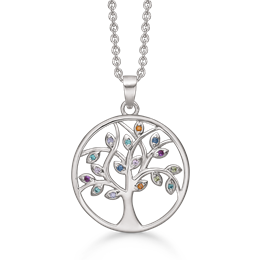 Sølv halskæde rhodineret livets træ i cirkel med syntetiske cubic zirconia i forskellige farver.