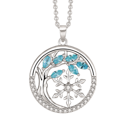 Sølv halskæde rhodineret livets træ i cirkel med blå akvamarin og syntetiske cubic zirconia.