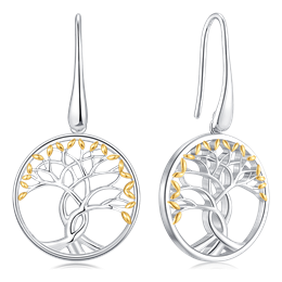 Sølv ørehænger rhodineret cirkel med livets træ, hvor stammen er flettet og bladene er forgyldte.