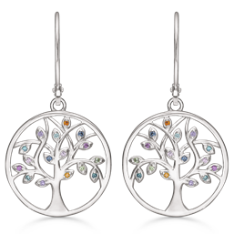 Sølv ørehænger rhodineret livets træ i cirkel med syntetiske cubic zirconia i forskellige farver.