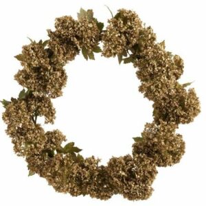 Smuk og dekorativ blomsterkrans med hortensiaer der kan bruges til dekoration hele året rundt, eller blot til at pynte op med ved juletid eller andre højtider. Blomsterkransen er lavet af plastic med stofblomster, men er meget naturtro, så den er både praktisk og langtidsholdbar. Kransens diameter er 41 cm, og den er 56 cm ialt i bredden.