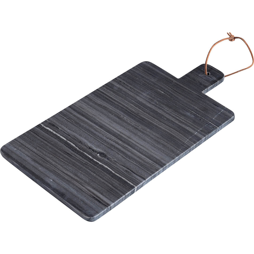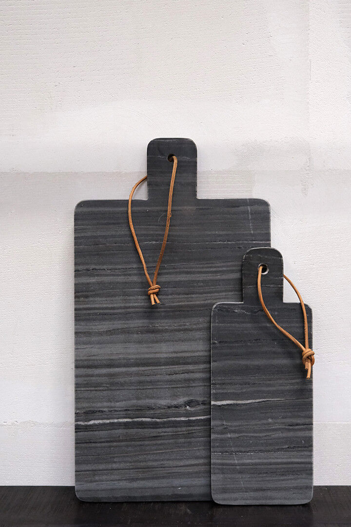 Flot serveringsbræt i grålig marmor med brun læderstrop. Brættet kan bruges til at servere lækre tapasretter på. Det er også virkelig flot at have stående fremme, når det ikke er i brug. OBS! Kan variere i farvespil og udtryk.