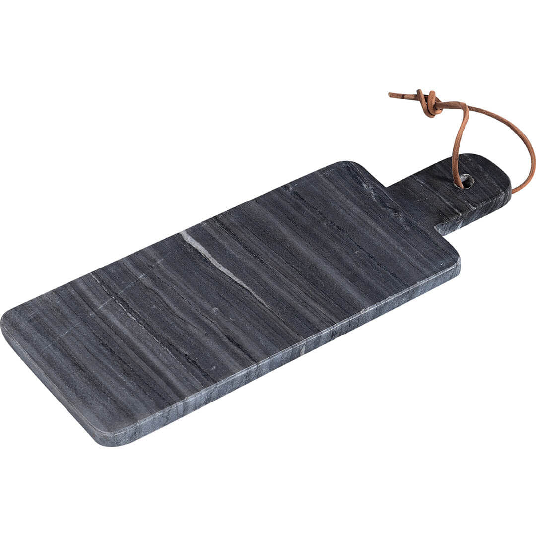 Flot smalt aflangt serveringsbræt i grålig marmor med brun læderstrop. Brættet kan bruges til at servere lækre tapasretter på eller brug det som en flot alternativ tallerken. Det er også virkelig flot at have stående fremme, når det ikke er i brug. OBS! Kan variere i farvespil og udtryk.