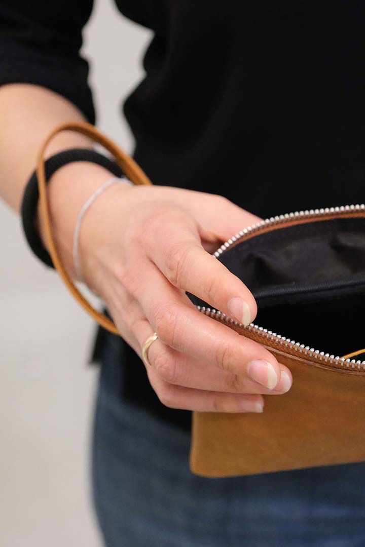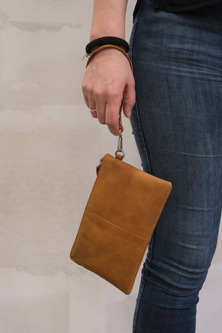 Enkelt lækker clutch i brunt læder med aftagelig læderstop. Lukkes med lynlås. Der er indvendig lynlåslomme og 3 lommer til kreditkort. Denne stilrene clutch har mange anvendelsesmuligheder. Nogen bruger den som en ekstra lille taske, som pung, til din mobiltelefonen eller til noget helt andet. Kun fantasien sætter grænsen.