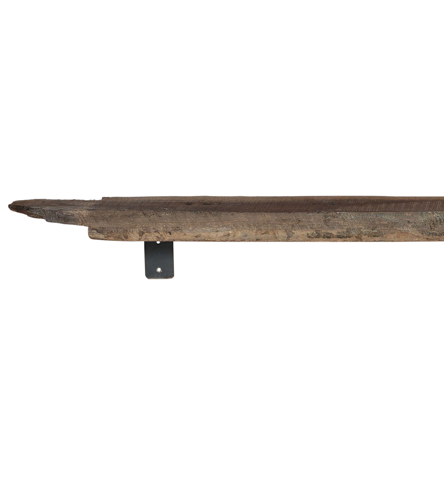 Denne rustikke hylde er lavet af genbrugstræ, der giver den masser af patina og charme. Hylden måler cirka 2 meter i længden og har et robust og industrielt look, hvilket gør den perfekt til at tilføje karakter og autenticitet til et rum. Træoverfladen fremstår rå og ubehandlet og bærer tydelige tegn på slitage og historie. Den simple konstruktion med metalbeslag understøtter hyldens solide og rustikke udtryk, og hylden kan bruges både i hjemmet, restauranter eller butikker til at skabe en dekorativ opbevaringsløsning med kant og sjæl.