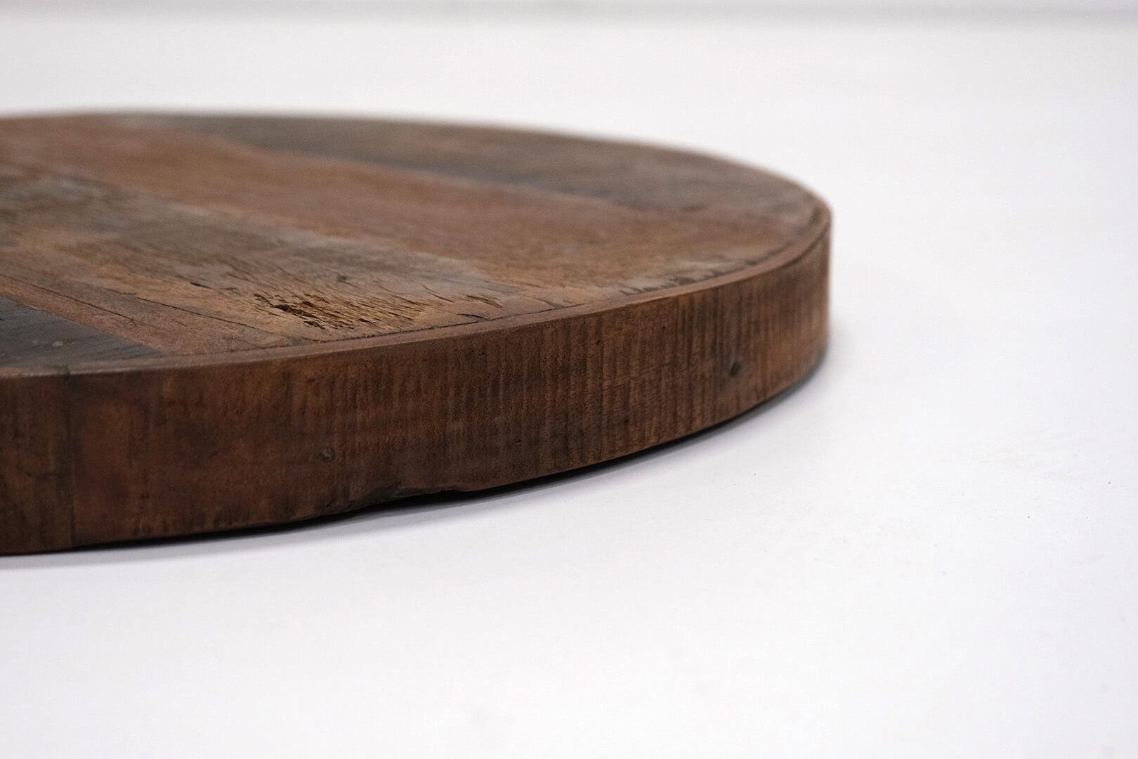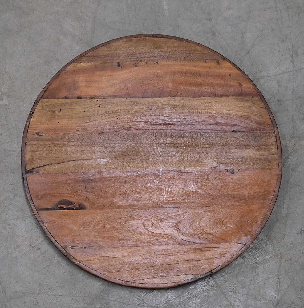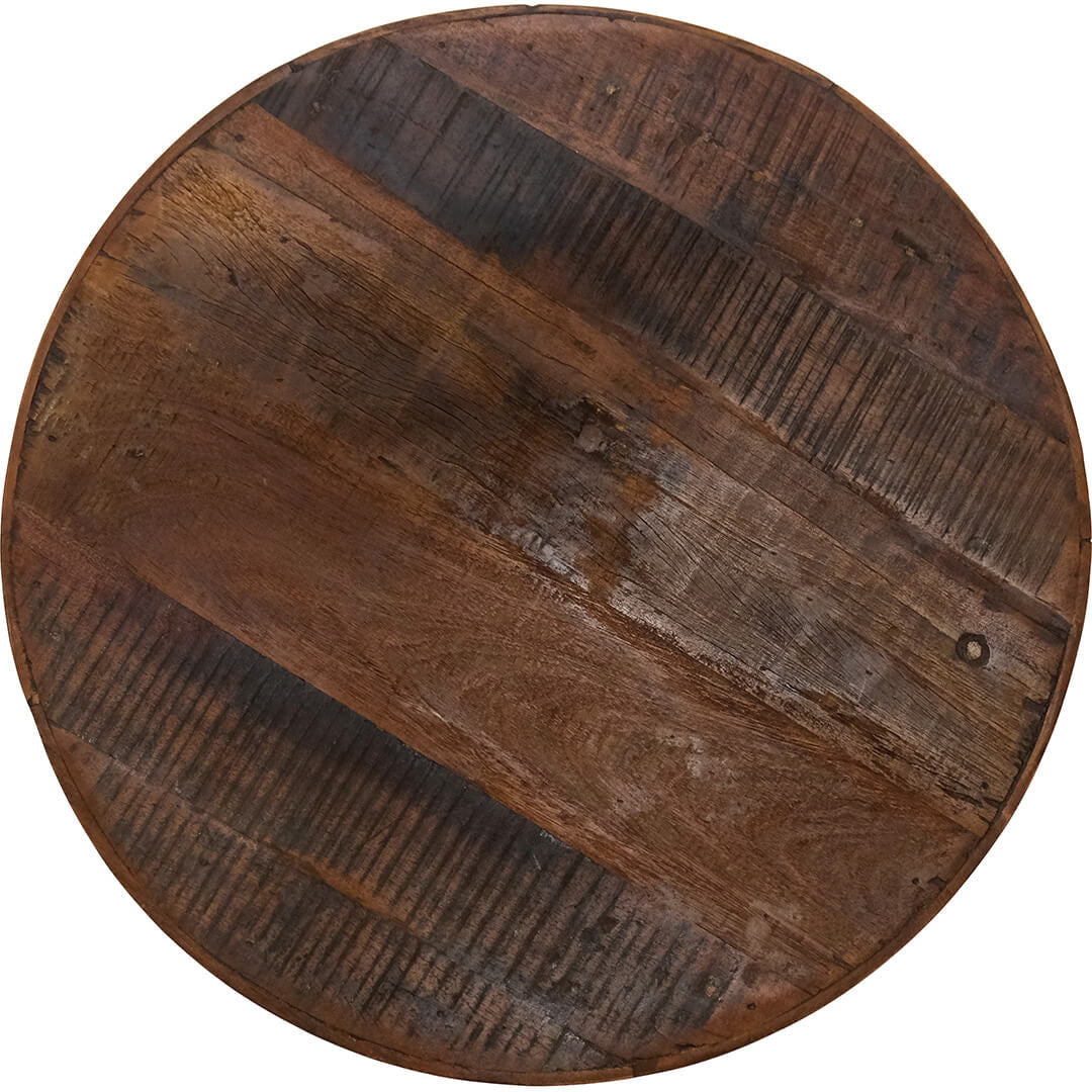 Smuk, rund bordplade i mørkt genbrugstræ. Denne smukke bordplade er perfekt til et intimt lille cafébord. Bordpladen kan også fås i en lidt større udgave med en omkreds på 70 cm. Bordpladen passer til de fleste af vores stel.