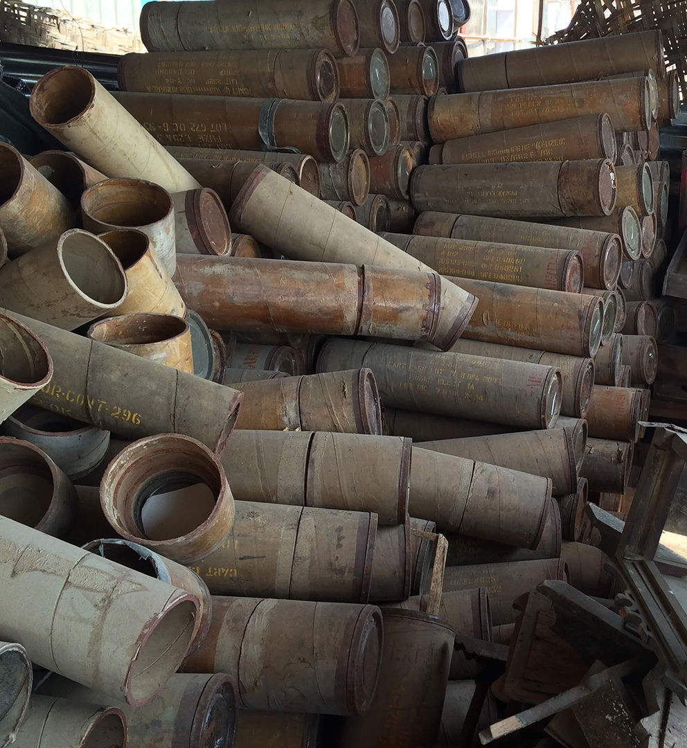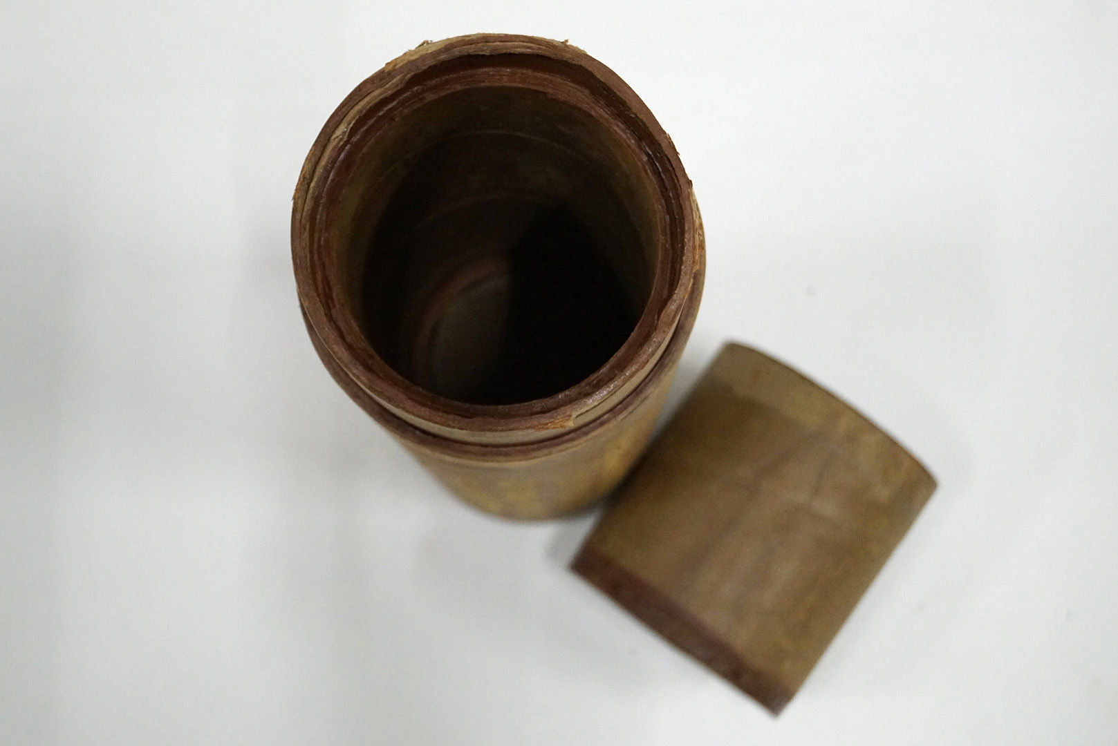 Rustikke gamle ammunitionsrør i kraftig pap med en bund og top i metal. Disse gamle ammunitionsrør kan bruges til opbevaring eller dekoration. De er alle forskellige og har en perfekt patina.