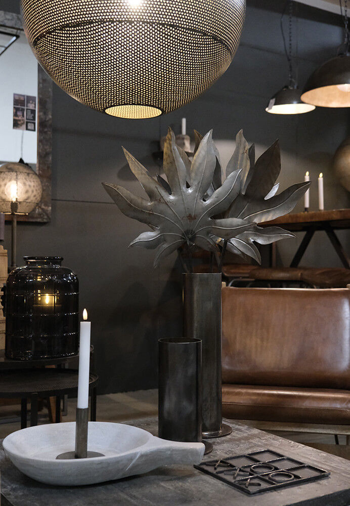 Stort smuk dekorativ araliablad i metal. Designet er i en skøn kombination af det rå metal og bladets fine lette udstråling. Stil dette araliablad i stor krukke eksempelvis sammen med evighedsblomster eller hæng blad dekorationen på en væg og opnå et moderne art nouveau udtryk.