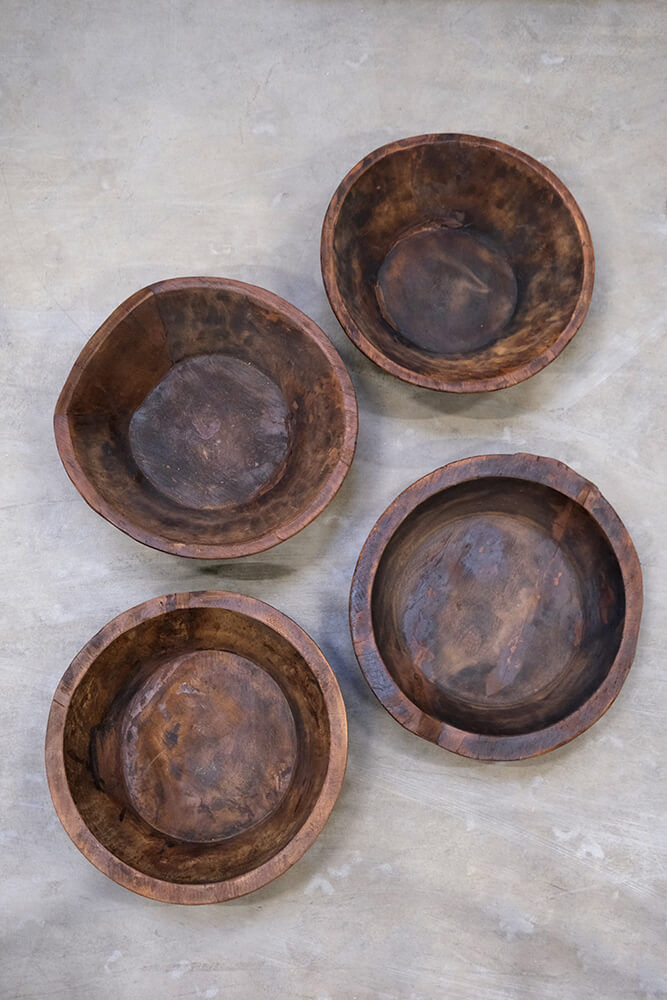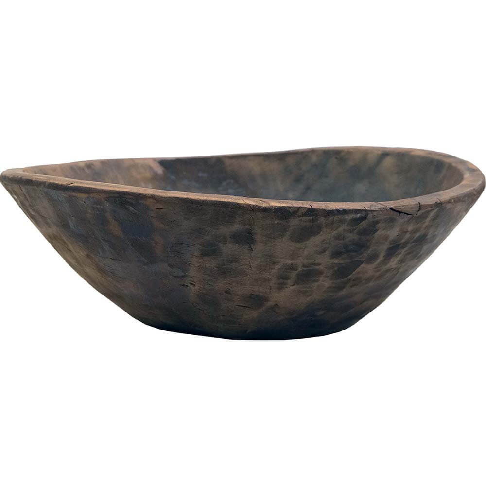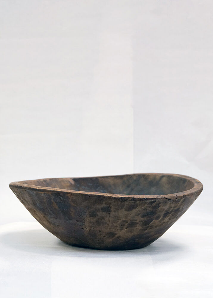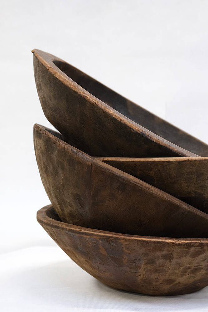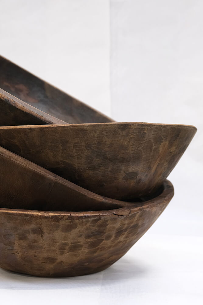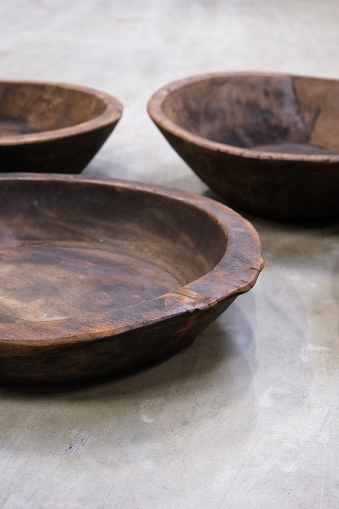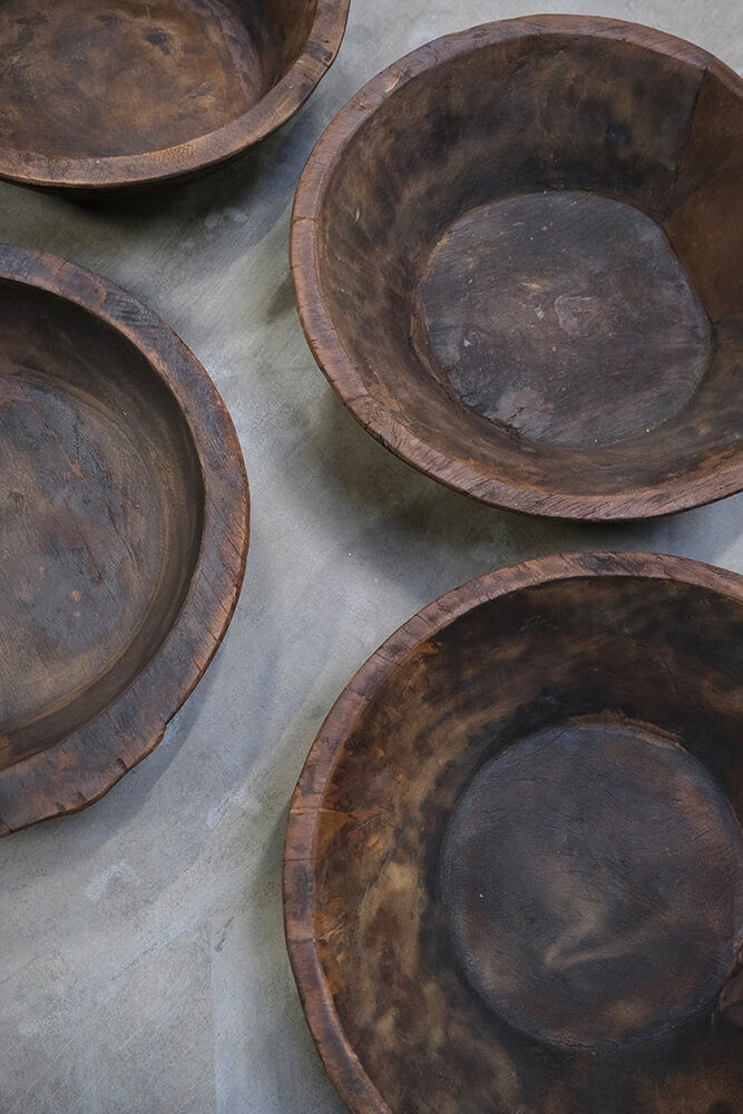 Disse imponerende gamle træskåle i størrelse L udstråler autenticitet og rå charme. Skålene har en diameter på 50-60 cm, og en højde der spænder fra 10-17 cm. Skålene er skabt i massivt træ og har en smuk, naturlig patina, som vidner om deres lange historie og håndværk. Med deres rummelige størrelse er de oplagte som dekorative elementer i din indretning. Brug dem som et rustikt midtpunkt på et spisebord, som et stilfuldt opbevaringsfad i entréen, eller som en opsats til planter og dekorationer. De skaber varme og personlighed i både private hjem, restauranter og butikker. Hver skål er har små variationer i form, farve og struktur – ægte skønhed med sjæl og historie.