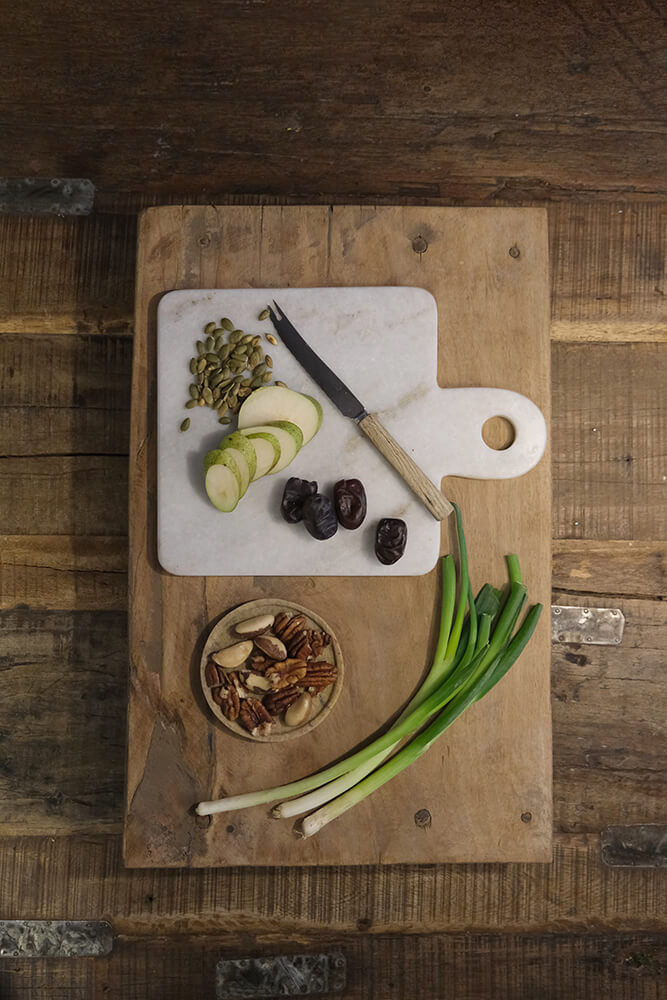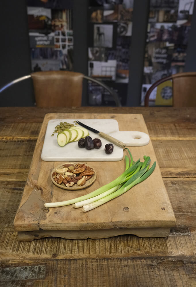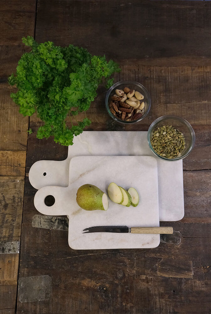 Et skærebræt i marmor kan bruges på begge sider og kan bruges både til at snitte på eller til servering af f.eks. ost og tapas. Skærebrættet i lyst marmor er dekorativt i sig selv, og kan også stå fremme i køkkenet med olier, salt og krydderurter på. Når det kommer til hygiejnen, så er marmor meget velegnet til skærebræt eller serveringsfad, da materialet ikke er porøst, og dermed ikke suger væsker. Til rengøring af marmorskærebrættet skal du blot anvende vand og sæbe. Opvaskemaskine anbefales ikke.